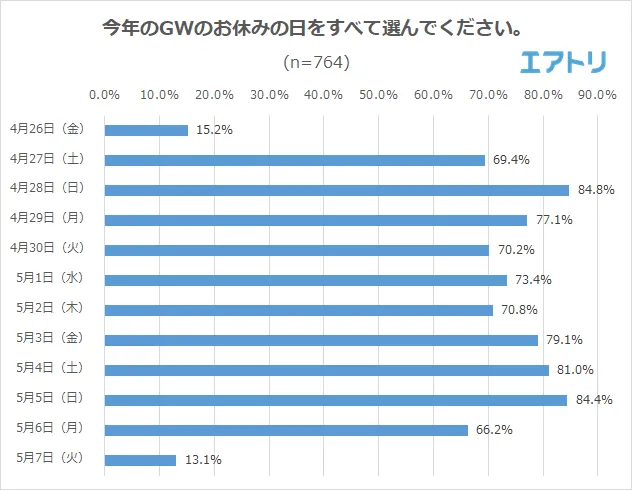 現在就業中の人にGW中の休日を聞いたところ、暦通りの休日は各日約6割から8割以上の人が休日となることが分かりました。特に日曜日である「4月28日」(84.8%)、「5月5日」(84.4%)が休日となる場合が多いようです。