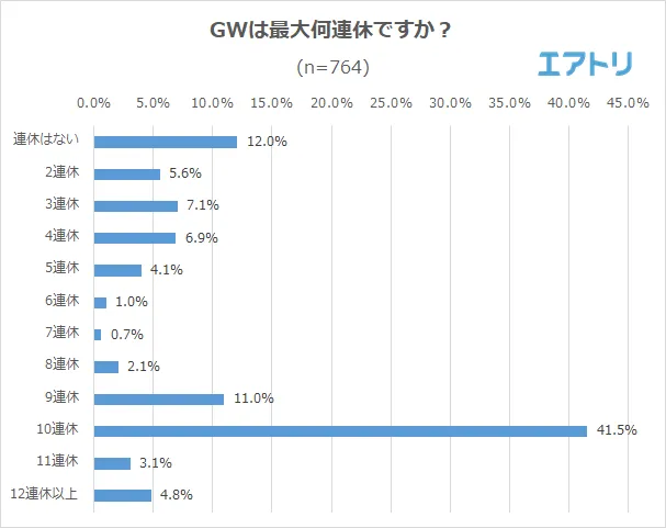 10連休と回答した人が最も多く、41.5%となりました。11連休以上を含めると10連休以上の人は約半数の49.4%にも上ることが分かりました。一方で「連休はない」(12.0%)と回答した人が2番目に多く、GWの休みに大きな差が出る結果となりました。