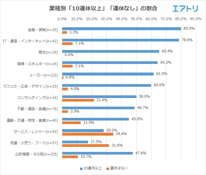 業種別でみると、10連休以上となる人が最も多いのは「金融・保険」(80.0%)業界となり、連休がない人が最も多いのは「サービス・レジャー」(34.4%)業界となりました。