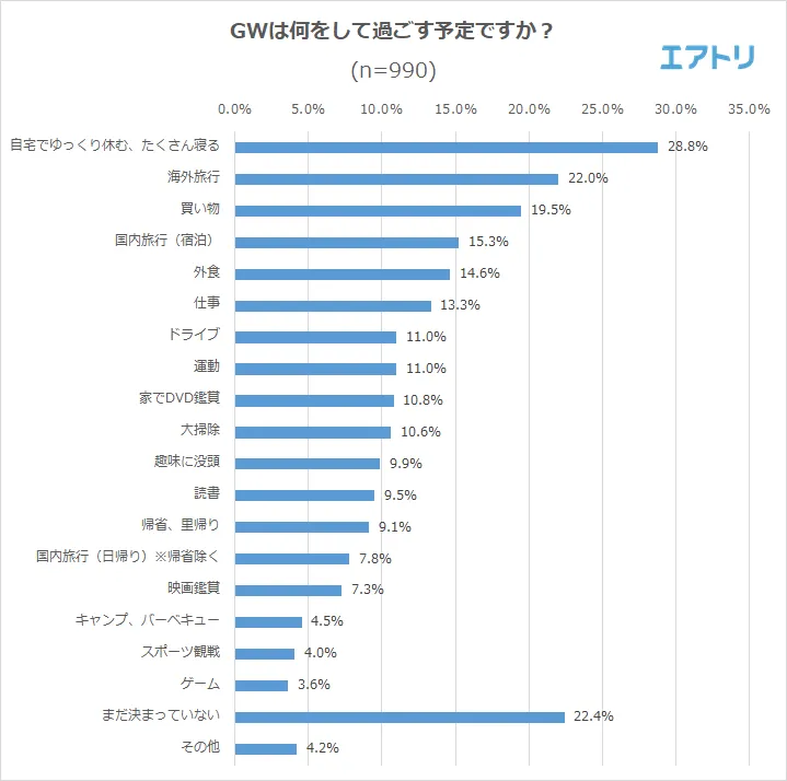 GWの過ごし方について聞いたところ「自宅でゆっくり休む」(28.8%)と回答した人が最も多く、次いで「海外旅行」(22.0%)、「買い物」(19.5%)、「国内旅行(宿泊)」(15.3%)、「外食」(14.6%)が続く結果となりました。