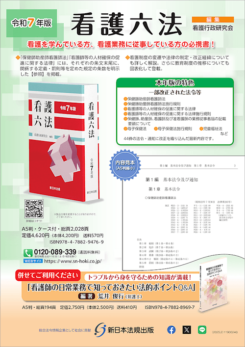 新日本法規出版株式会社(所在地:愛知県名古屋市中区、代表取締役社長:河合誠一郎)は、新刊『看護六法 令和7年版』(編集:看護行政研究会)を2025年3月7日(金)に発売いたしました!