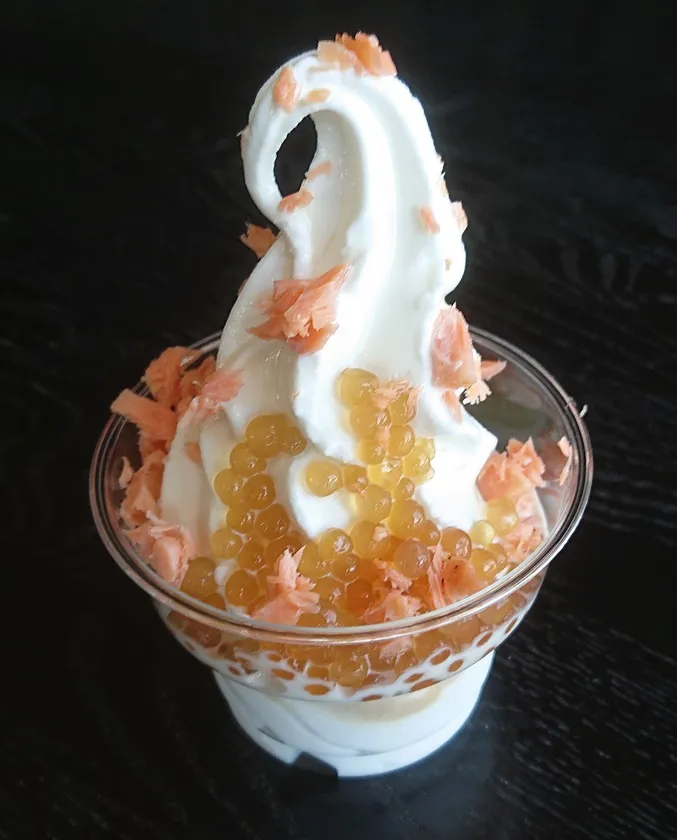 (3)タピオカから作った「自家製イクラもどき」と「自家製鮭のほぐし身」とのトッピングで、日本初!の鮭×イクラの親子ソフト。