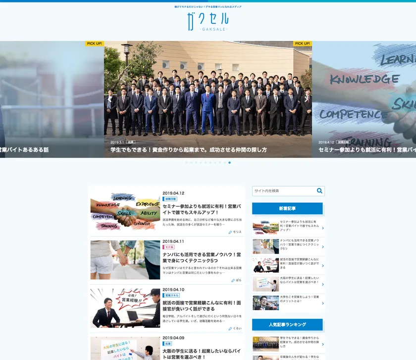 現役大学生の営業マンが運営する、成長したい若者のための情報サイト「ガクセル」は、営業ノウハウや自己啓発はもちろん、就職活動や学生起業に役立つ体験談、異性にモテる方法から営業バイトのはじめ方まで情報満載。「現状を変えたい」「成功したい」ガクセルはそんな思いを全力で応援します!