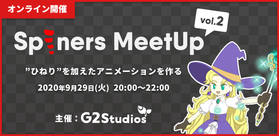 G2 Studios株式会社 (本社:東京都渋谷区、代表取締役社長:桜井 敦)は、Spineアニメーター向けイベント「Spiners MeetUp vol.2」を9月29日(火)にオンラインで開催することをお知らせします。本イベントは、「"ひねり"を加えたアニメーションを作る」をテーマとしてハンズオン形式で実施します。特別ゲストとしてSpine公式スタッフを迎え、アニメーション制作風景の紹介や質疑応答を行います。