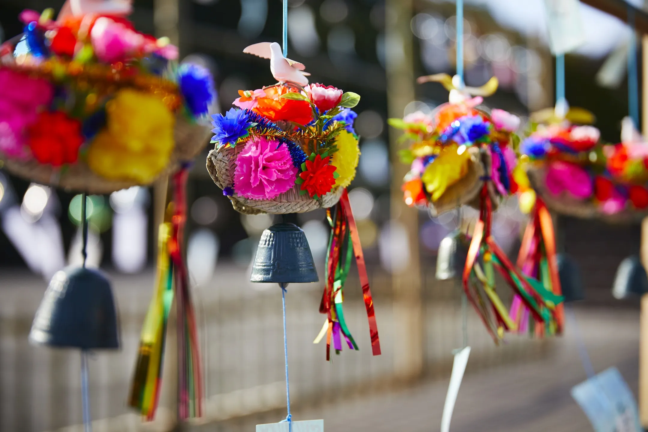 花笠は、色とりどりの花や鳩の飾りがついた被り物で、青森ねぶた祭の踊り手「跳人(はねと)」に欠かせない衣装のひとつです。鉄器でできた風鈴には小さな花笠がついており、青森ねぶた祭を連想させるご当地風鈴です。