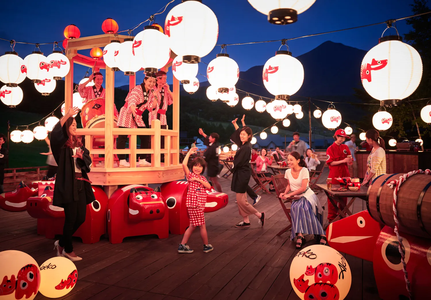 民謡「会津磐梯山」は、古くから「盆踊り歌」として歌い継がれていた曲に囃子(はやし)言葉を加えてアレンジされた歌です。「ちょいさ」や「えんや」といった軽快な掛け声とともに輪になって踊り、今でも盆踊りの定番曲として会津では親しまれています。当イベントでは、会津の郷土玩具「赤べこ」をあしらったオリジナルの「赤べこやぐら」を、夏限定で野外に設置し、その上で地元の民謡歌手による歌と囃子の生演奏をします。ゲストは、スタッフと共に歌詞に出てくる磐梯山を望みながら、やぐらを囲んで踊ります。