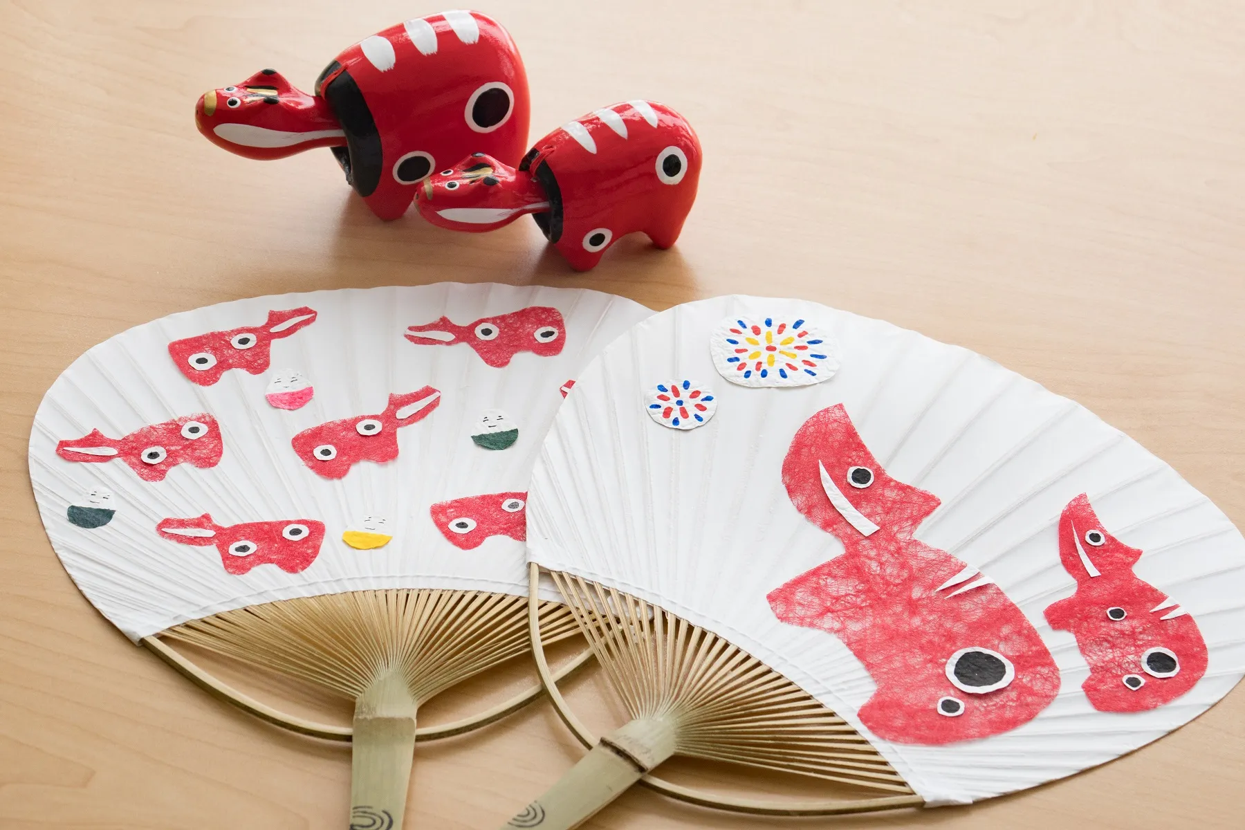 踊りの前に、無地のうちわに赤べこや起き上がり子法師など会津にちなんだ絵柄を描いてオリジナルのうちわを作ることができます。盆踊りに欠かせないアイテムであるうちわで、祭り気分を盛り上げます。