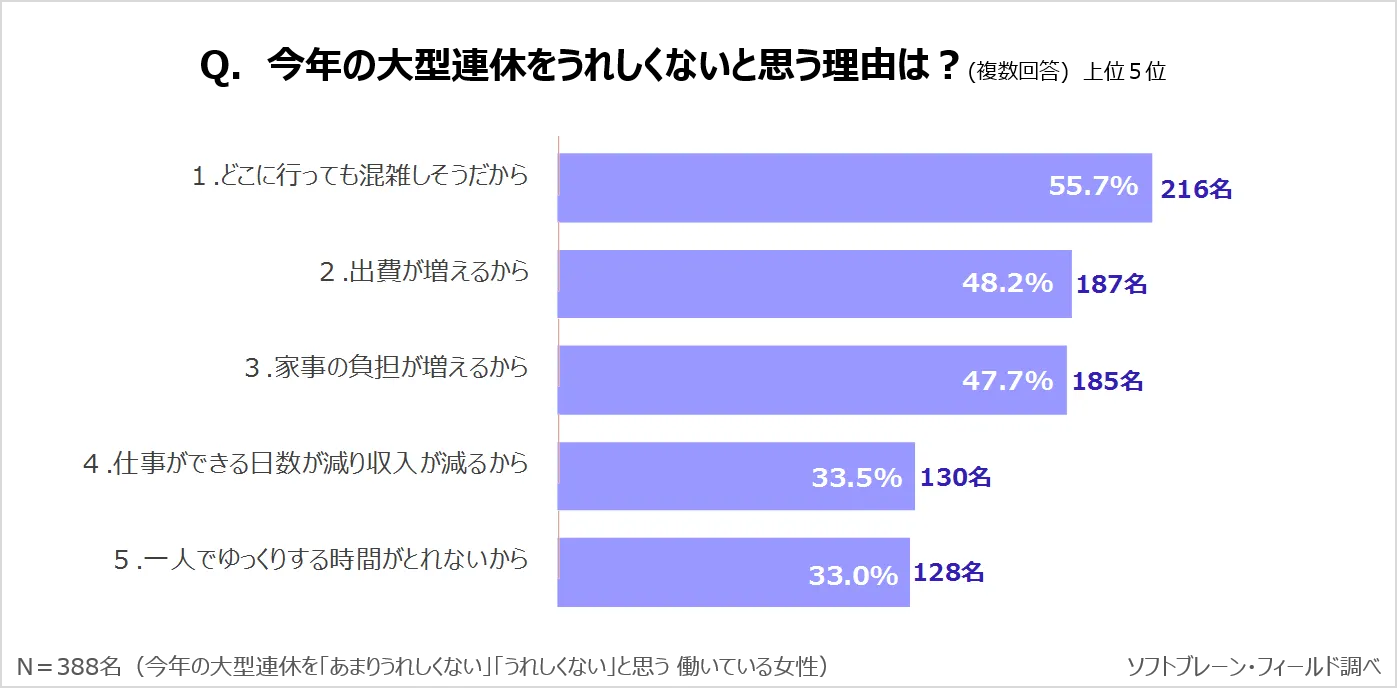 「うれしくない」と回答した方(388名)を対象に複数回答で理由を聞くと、「1.どこに行っても混雑しそうだから」が55.7%でもっとも多く、半数を超える結果となりました。「2.出費が増えるから」の48.2%、「3.家事の負担が増えるから」の47.7%を上回る結果となりました。他にも「4.仕事ができる日数が減り収入が減るから」が33.5%で上位となり「派遣社員なので給料が減るので困る(20代)」や、「有給休暇ではないので、無給になり給料が減るので困る(60代)」といった時給制・日給制で働く人の収入減が理由として挙がりました。また、大型連休中も仕事をする方からは、「サービス業の為大型連休は関係ないです。お客様が増えすぎるのもやはり困りそうです(40代)」や、「道路が混んで、仕事に行くのが大変(50代)」といった声が挙がりました。