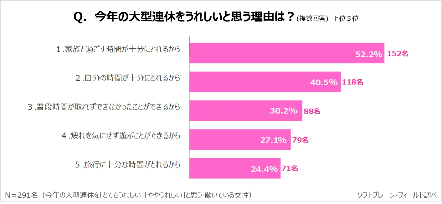・「うれしくない」理由は、「1.どこに行っても混雑しそうだから」が55.7%で最多。他にも「4.仕事ができる日数が減り収入が減るから」が33.5%で上位となり、時給制・日給制で働く人の収入減が理由として挙がる。一方で、「うれしい」理由は、「家族と過ごす時間が十分にとれるから」が52.2%で最多となったが、その反面「家族と過ごす時間がとれるが、家事の負担が増えることが予想される(40代)」家事の負担の増加を心配する声が多く挙がる。