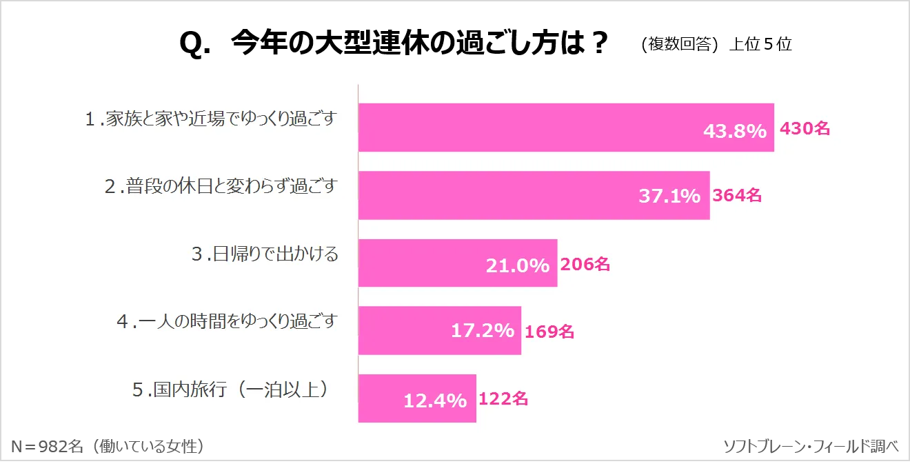 大型連休の実際の過ごし方を複数回答で理由を聞くと、「1.家族と家や近場でゆっくり過ごす」が43.8%でもっとも多く、「2.普段の休日と変わらず過ごす」が37.1%と続き、「3.日帰りで出かける」の21.0%や、「5.国内旅行(一泊以上)」の12.4%を上回り、大型連休でものんびり過ごす方が多いことがわかりました。(図表4)