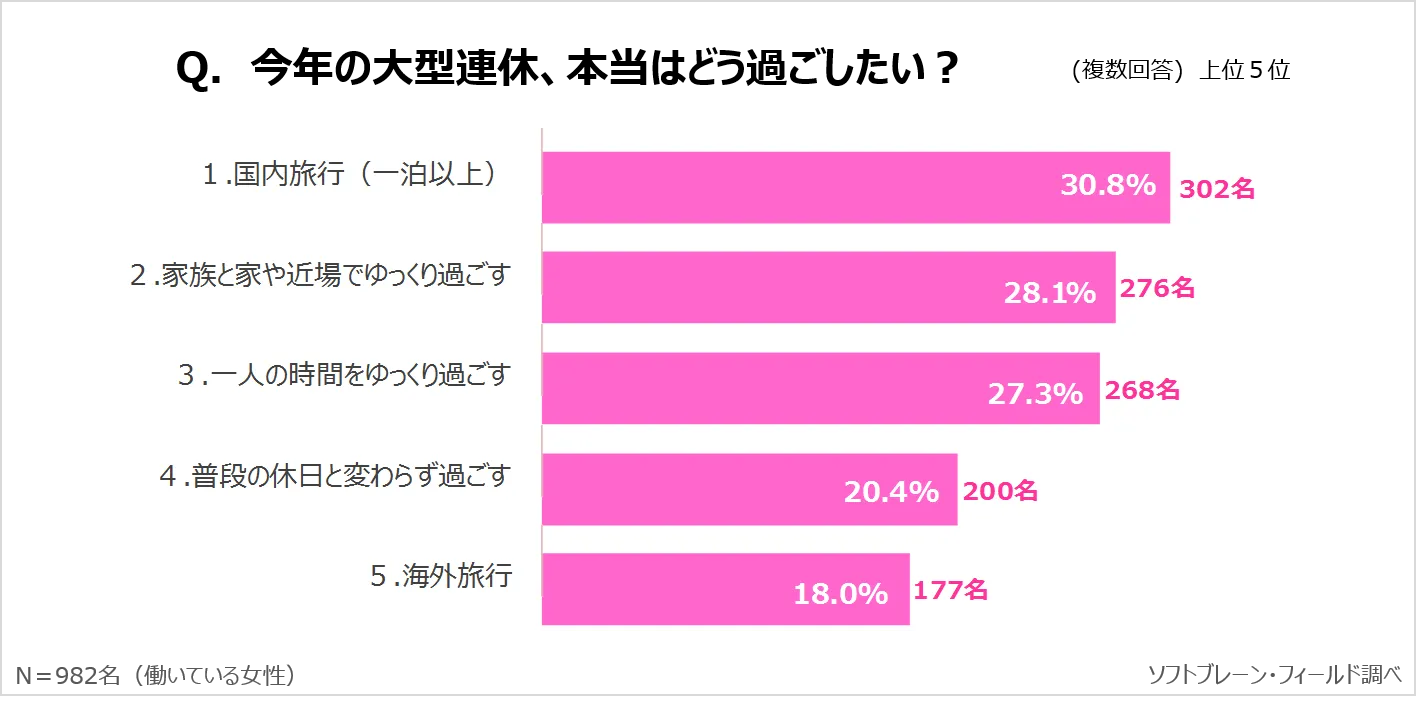 一方で、大型連休を本当はどう過ごしたいか複数回答で理由を聞くと、実際の過ごし方と順位が入れ替わり、実際の過ごし方では12.4%であった「1.国内旅行(一泊以上)」が30.8%でもっとも多く、18.4ポイント上回る結果となりました。他にも「5.海外旅行」が18.0%でランクインするなど、家や近場でのんびり過ごすのではなく、いつもよりも少し遠出をして、国内旅行に行きたいと考える方が多いことがわかり、働く主婦のホンネが垣間見える結果となりました。