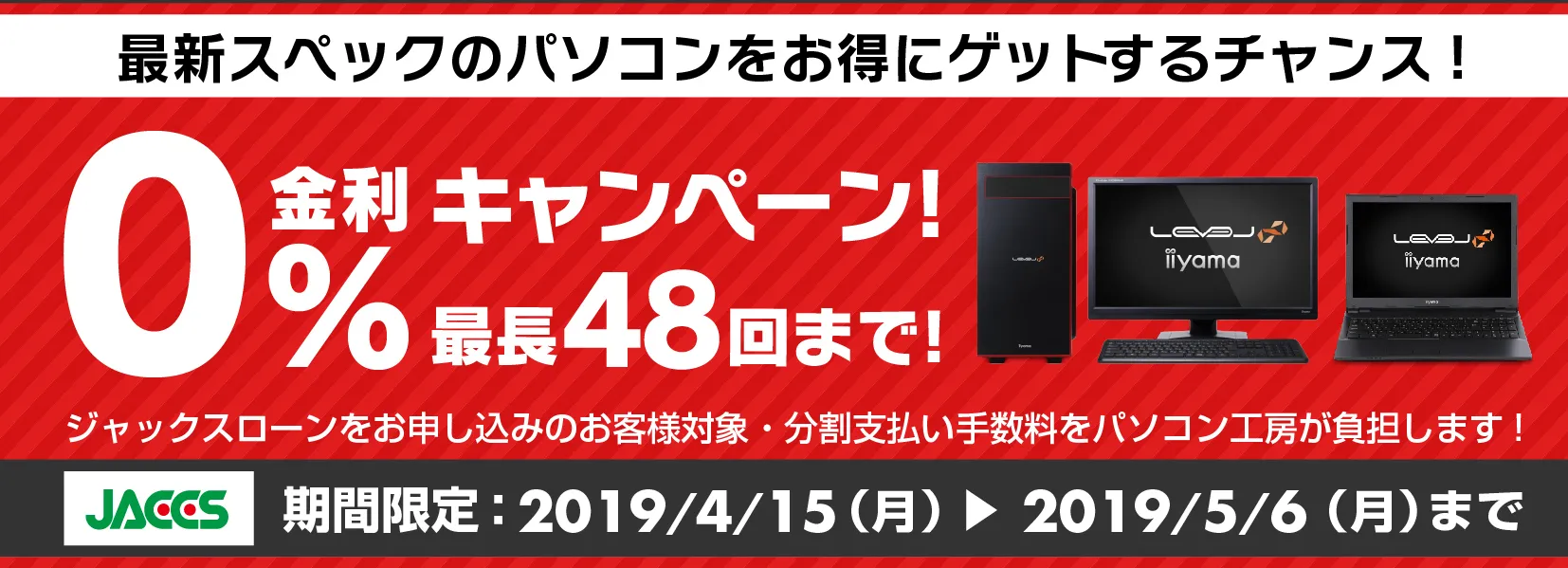 パソコン工房・グッドウィルを運営する株式会社ユニットコム(代表取締役:端田 泰三、本社:大阪市浪速区)は、パソコン工房Webサイトおよび全国のパソコン工房・グッドウィル各店舗にて、ジャックスローンをご利用の場合、分割支払い金利手数料が最長48回まで無料になる『ショッピングローン0%金利キャンペーン』を2019年4月15日(月)より開始しました。
