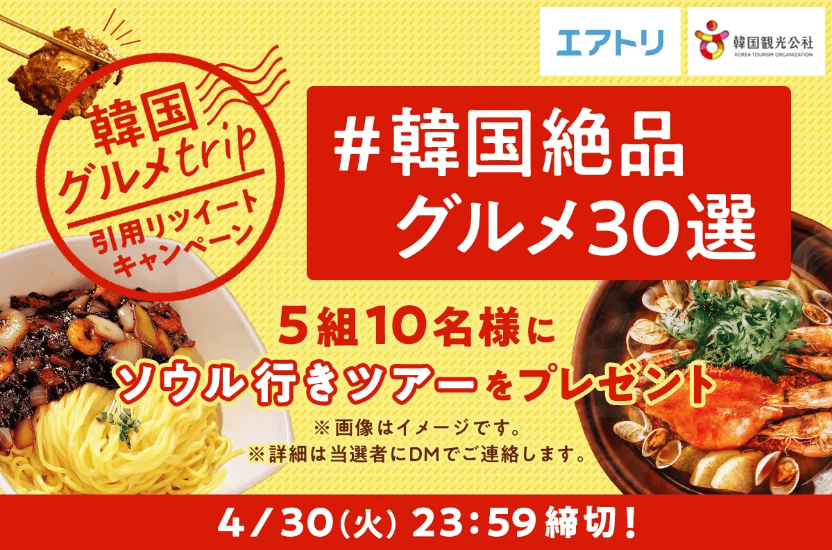 | 参加方法 | 【1】エアトリ公式Twitter(@airtrip_corp)をフォロー 【2】特設ページ(https://www.skygate.co.jp/tour/campaign/kto/gourmet/)で紹介している「韓国絶品グルメ30選」の中から食べてみたいグルメを選択 【3】ハッシュタグ「#韓国絶品グルメ30選」と【2】で選んだ食べてみたいグルメを記載して、エアトリ公式Twitterで投稿されたキャンペーンツイートを引用リツイート |