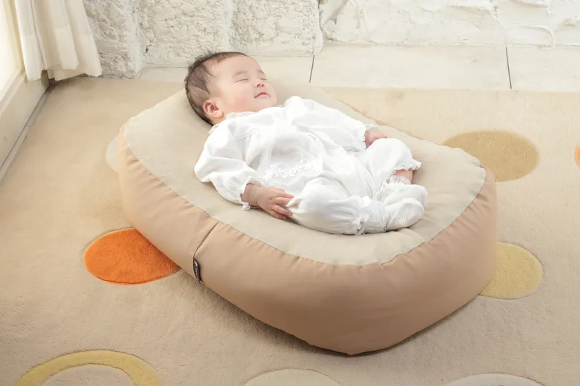 おやすみたまご(R)は、特許を取得した当社オリジナルの商品です。特殊な生地構成と発泡ビーズの組み合わせ・発泡ビーズの量が赤ちゃんを丸く包み込むように寝かせます。