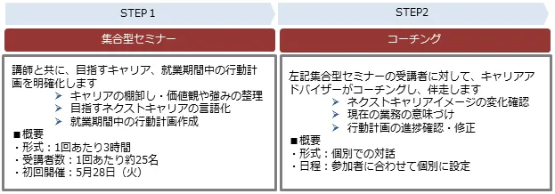 ・内容 STEP1「集合型セミナー」とSTEP2「コーチング」を実施します。