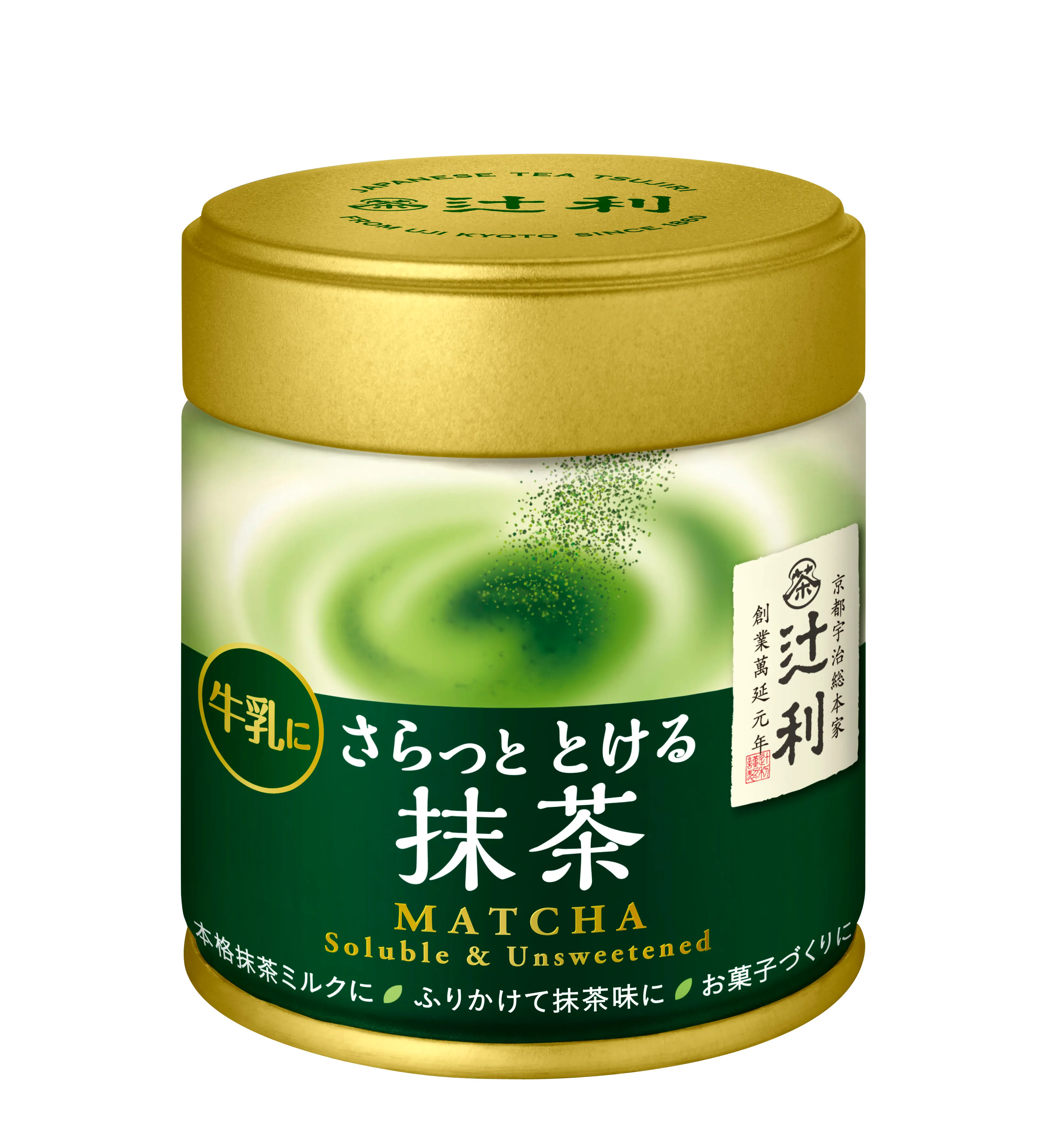 「<辻利>さらっととける抹茶」は、辻利の茶匠厳選の宇治抹茶を使用した顆粒状の抹茶です。冷たい牛乳や水に溶けやすく、ダマにならずにキレイにさらっと溶けます。甘くないのでドリンクだけでなく、お菓子作りや料理にも最適です。