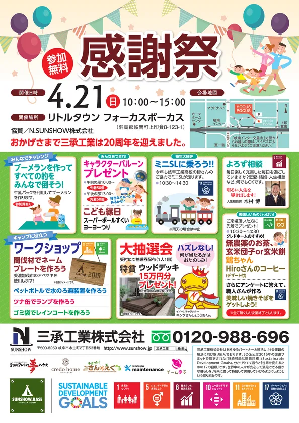 三承工業株式会社(本社:岐阜県岐阜市、代表取締役:西岡 徹人、以下:三承工業)が展開する住宅ブランド「SUNSHOW夢ハウス」は、2019年4月21日(日)、岐阜県羽島郡岐南町にあるリトルタウン フォーカスポーカス(通称:フォーカスポーカス)にて同社のお客様や地元地域の方々に向けたイベント『感謝祭』を開催いたします。