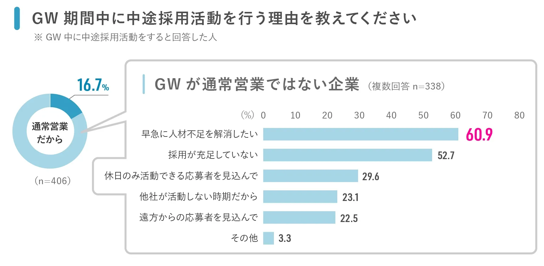 「早く人材不足を解消したいので、GW中も”あえて積極的に”面接する」と、「早く人材不足を解消したいが、人員確保・会社のイメージダウンにつながるので、”あえてやらない”」。調査結果からは、大型連休中に、人材不足にどう向き合うかの求人企業それぞれの事情が見えてきました。
