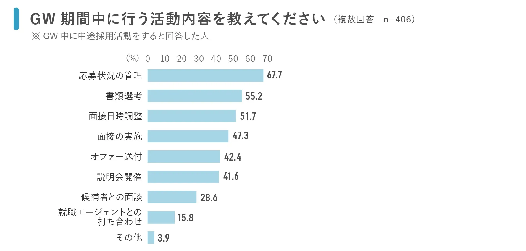GW期間中の「採用活動」の内容は、応募状況の管理(67.7%)、書類選考(55.2%)と、自社内でできる活動が中心だが、「面接の実施」が47.3%、「説明会開催」が41.6%と、採用活動を実施する企業の中には、実際に選考を進めていくなど積極的な採用姿勢が浮き彫りになった。