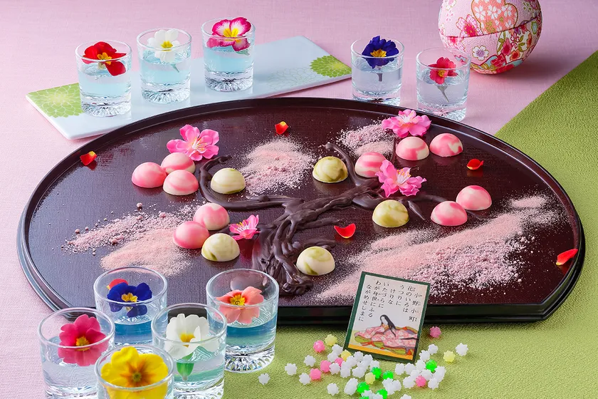 絶世の美女として有名な小野小町が、色あせた桜に老いゆくわが身の嘆きを重ねて詠んだ歌。華やかな桜の花の色が次第にうつろう様子を、桜リキュールガナッシュと抹茶のガナッシュを使用した「大人のさくらぼんぼん」と「抹茶のぼんぼん」で表現しました。また、「エディブルフラワーのブルーキュラソーとブルーベリーのジュレ」は、物思いにふける春の長雨を表したスイーツです。ぼんぼんと共にお召し上がりいただくことで、その甘さを引き立てます。