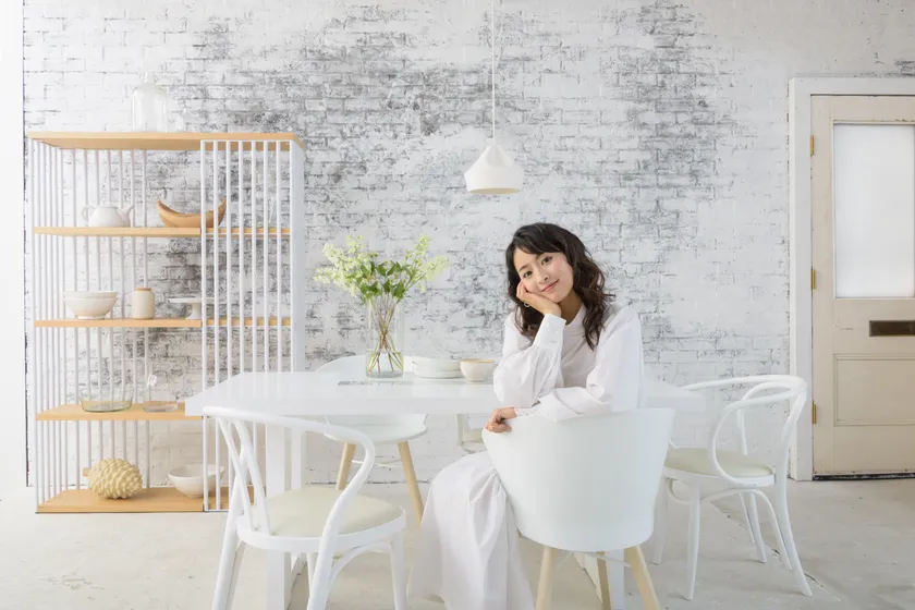 自宅でも白い家具を愛用しているというロン・モンロウさんのピュアな魅力が、白でまとめられたお部屋の中に溢れています。