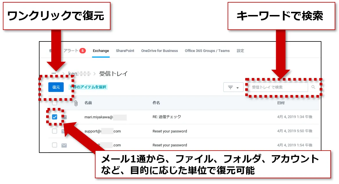 重要なデータを契約期間内は無期限・容量無制限で保管することができ、アーカイブとしての利用はもちろん、退職によるアカウント削除で消えてしまったデータの復元や、マルウェア感染やその他予期せぬ原因で消失したファイルの復元など、「Office 365」のみでは対処が難しい様々なケースでご活用いただけます。