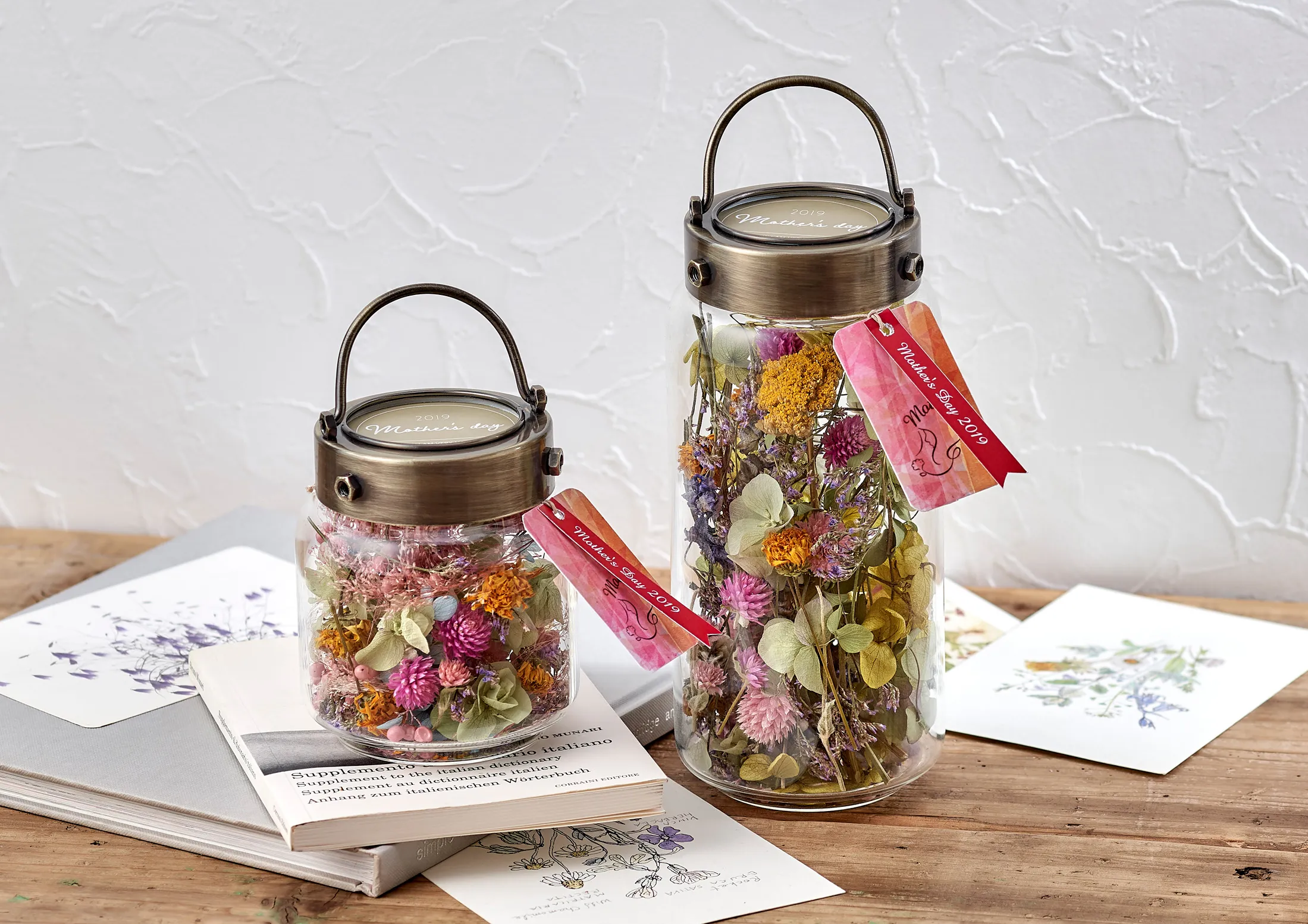 おしゃれなガラスキャニスターに入ったカラフルな ドライフラワーボトルやアレンジする楽しさも贈れる スタイリッシュな花瓶と花束のセット等 SNSでも話題の母の日ギフト