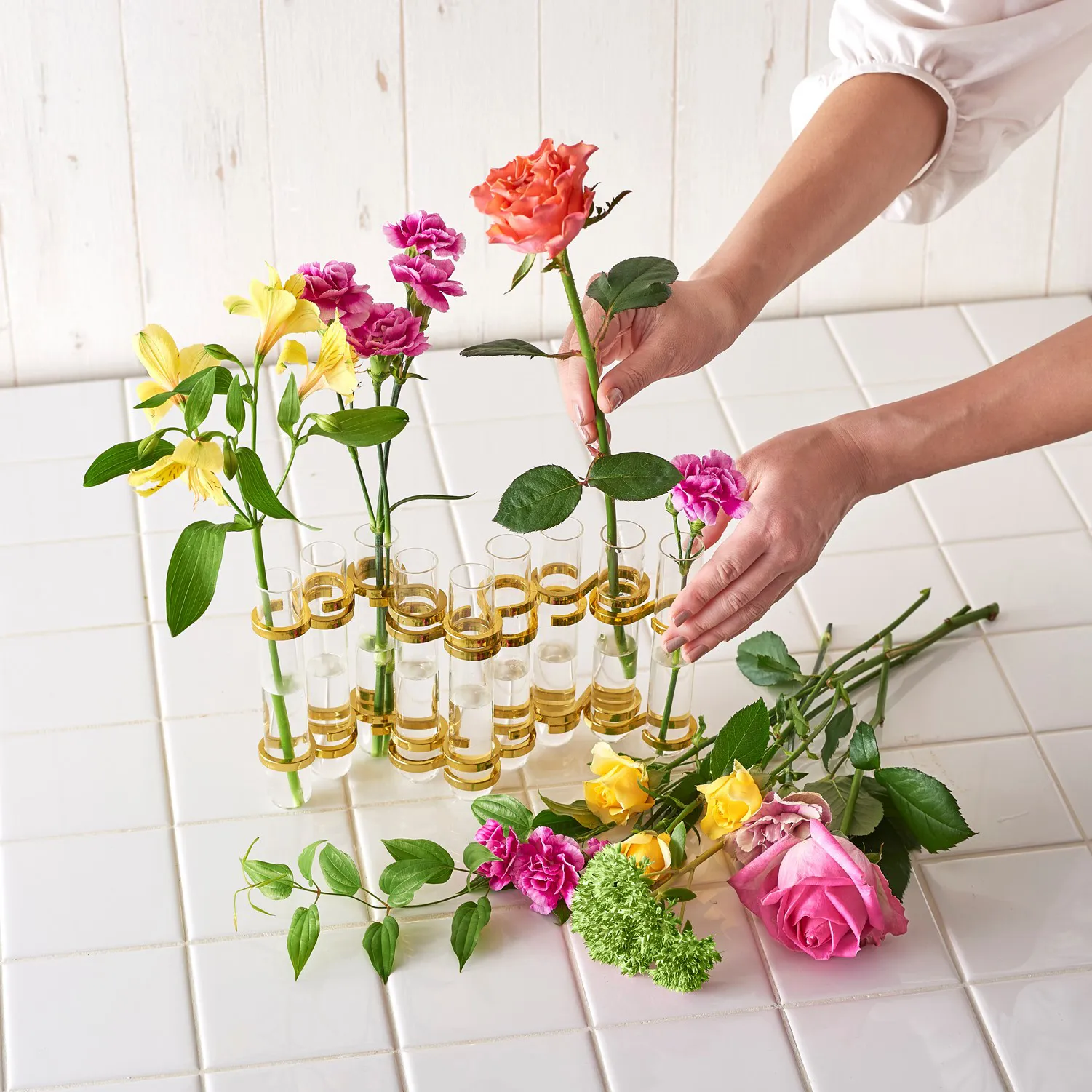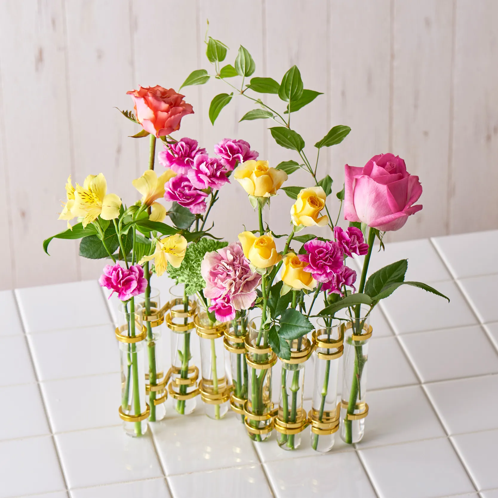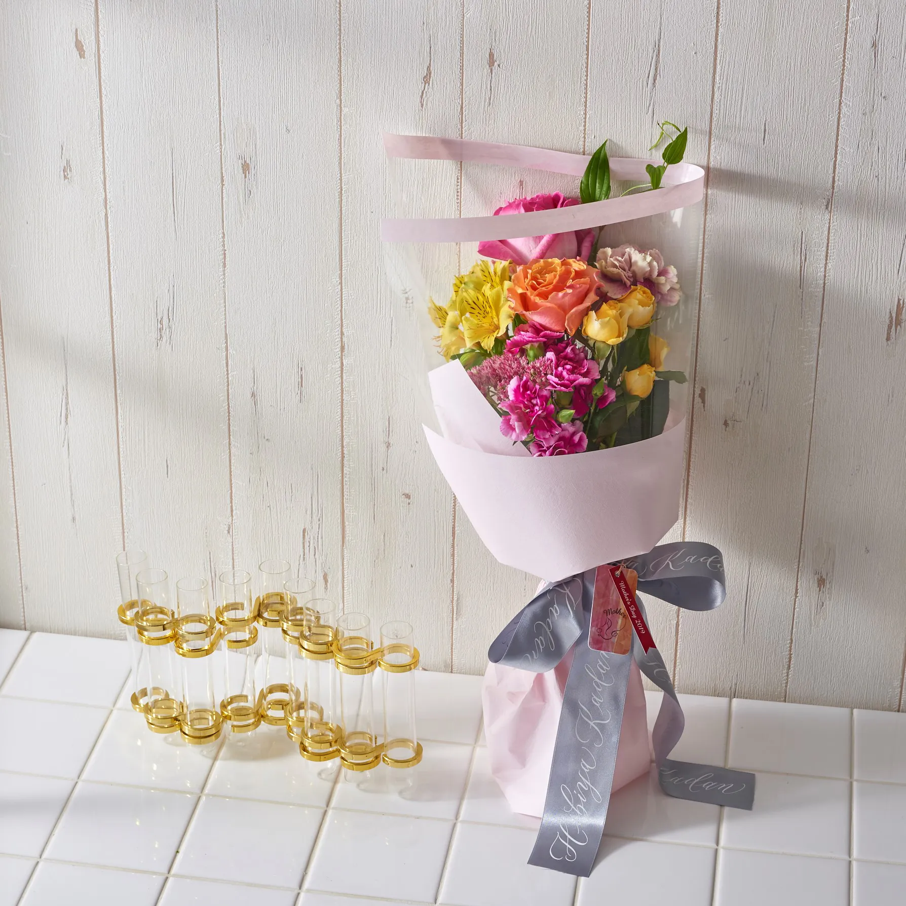 お部屋をぱっと明るくするような艶やかな色合いの花と、ゴールドのラインがポイントのスタイリッシュな花瓶のセット。花瓶は、まるで試験管を連ねた様なユニークなデザイン。それでいて、形を変えて動きを出せる、連結を外して使える、パーツを分解してお手入れ出来る、といった実利を伴う賢さも兼ね備えています。贈られたお母さんも1本1本どれに入れようかなと飾るときの楽しさも贈ることができる体験型セットギフトです。
