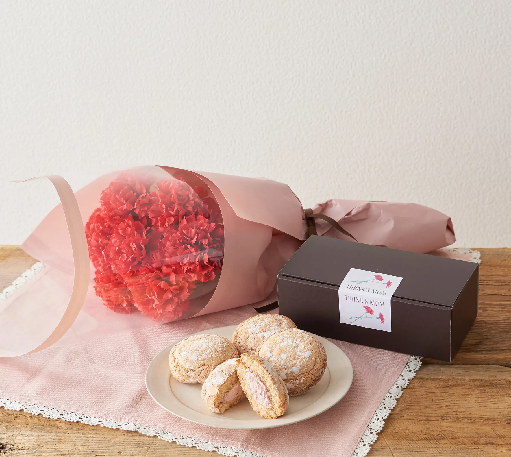 パティシエが一つ一つ手仕事で焼き上げるブッセは、表面はさっくり、中はふんわりとした軽い口あたりの焼き菓子です。ローズが香るクリームをサンドし、上品なローズの香りが口の中に広がります。お母さんへの想いを込めた赤い大輪カーネーションの花束とともにお届けします。