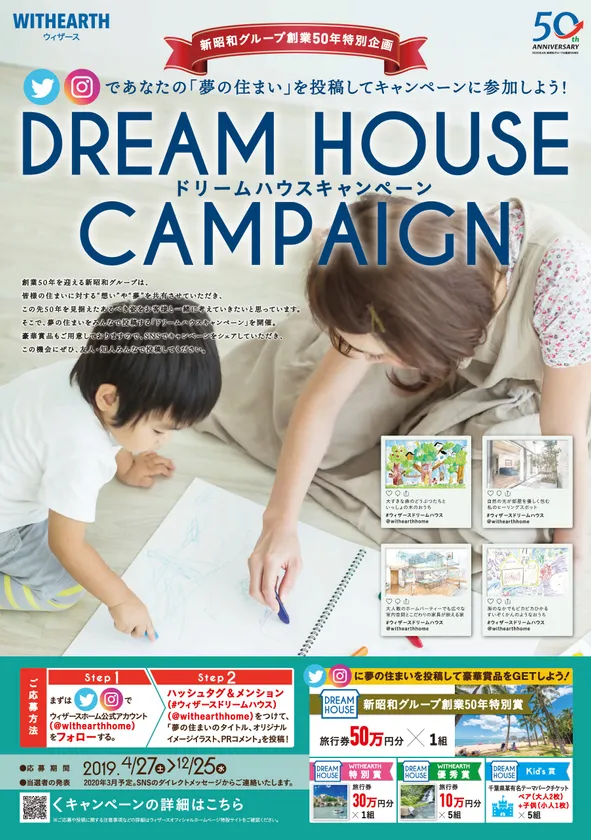 2020年4月に創業50周年を迎える新昭和グループの住宅ブランド「ウィザース(販売会社の所在等については末頁に記載)」では、創業50年特別企画として「ドリームハウスキャンペーン」を開催し、2019年4月27日(土)~12月25日(水)まで、夢の住まいをSNSで募集いたします。