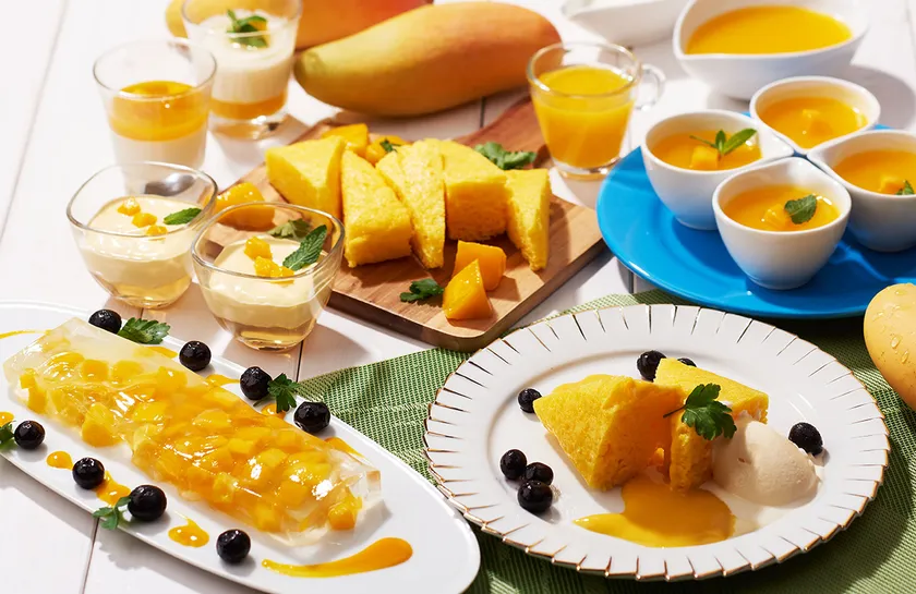 プリンやパンナコッタ、白玉ぜんざい、蒸しケーキなど、バリエーション豊かな和洋中のマンゴースイーツがどれも食べ放題で、マンゴーの濃厚で芳醇な味わいを心ゆくまでご堪能いただけます。