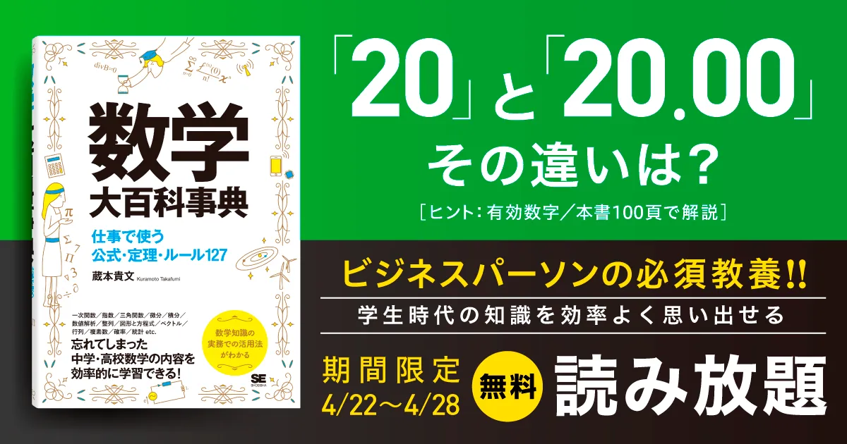 株式会社翔泳社(本社:東京都新宿区舟町5、社長:佐々木幹夫)は、『数学大百科事典 仕事で使う公式・定理・ルール127』(蔵本貴文/著)を2019年4月22日(月)~4月28日(日)の期間限定で、全ページを無料公開します。