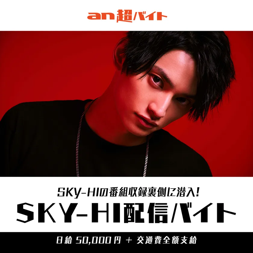 総合人材サービス、パーソルグループのパーソルキャリア株式会社(本社:東京都千代田区、代表取締役社長:峯尾 太郎)が運営するアルバイト求人情報サービス「an」< https://weban.jp/ >は、思わず挑戦してみたくなるような「an超バイト」の新企画として、パフォーマンスグループAAAのメンバー・SKY-HIがパーソナリティーを務めるインターネットラジオ番組収録の裏側に潜入し、SKY-HIのオフショットなどをSNSでファンに向けて配信する“SKY-HI配信バイト”を2名募集します。採用された方には日給5万円と交通費の他、SKY-HIサイン入りグッズも進呈されます。