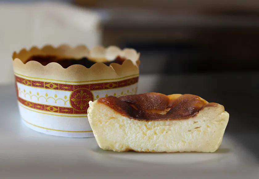オーブンで時間をかけてゆっくりと焼かれた「バスクチーズケーキ」は表面の焦げがほどよくほろ苦く、柔らかで濃厚なチーズとマッチして今までに食べたことのない食感と濃厚でクリーミーなチーズケーキになっています。