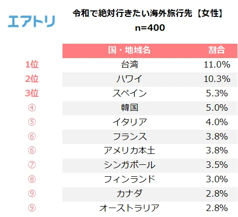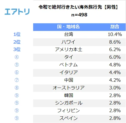 男性は1位「台湾(10.4%)」、2位「ハワイ(8.6%)」、3位「アメリカ本土(6.2%)」となり、女性は1位「台湾(11.0%)」、2位「ハワイ(10.3%)」、3位「スペイン(5.3%)」となりました。男女とも台湾、ハワイの人気が高いようです。