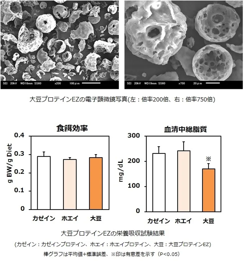 また、大豆プロテインEZ摂取群では、動物性プロテイン摂取群に比べて血中総脂質が有意に低いことが明らかになりました。