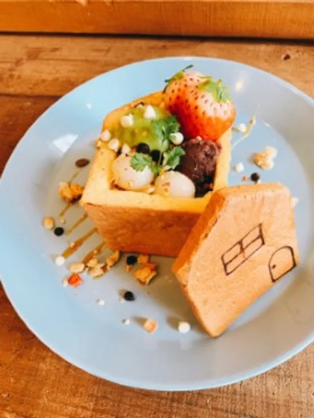 おうちパンの蓋と本体上部にフレンチトーストの卵液をつけてオーブンで焼き、焼き上がった中に、白玉、抹茶アイス、つぶあん、イチゴ等の食材をバランスよく入れています。お皿にはキャラメルソースを。おうちパンの周りには、粉糖をふりかけ見た目にも可愛らしく飾り付けをしています。洋と和の意外な組み合わせが絶品です。