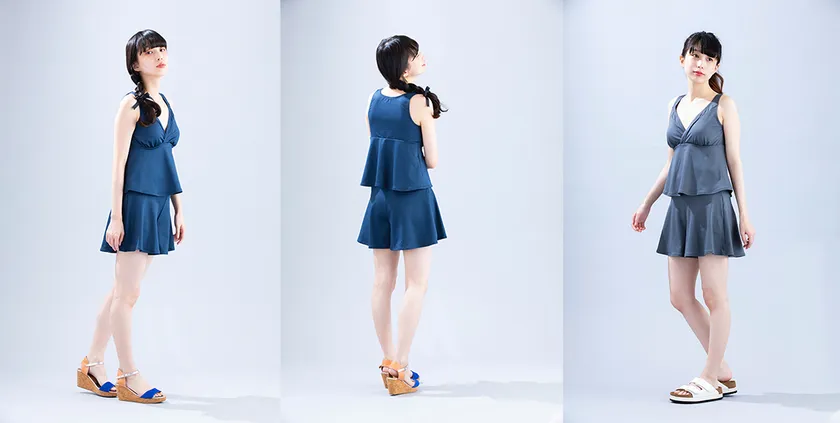 大人の女性に、プール、海で水着に求める機能をそれぞれアンケートしたところ、プールでは「露出が控えめ」「水着を着る機会はない」「着替えがしやすい」。海では「水着を着る機会はない」「かわいい」「体型カバーができる」がそれぞれ上位を占めることになりました。そもそもプール用と海用で水着を使いわけている人は26%と少数派でもあることから、一着でプール、レジャー両方に使える汎用性の高い水着が求められていると仮定。第6弾の今回は、フィットネス水着とレジャー水着(タンキニなど)の中間を狙ったシリーズ初のセパレート型を企画しました。