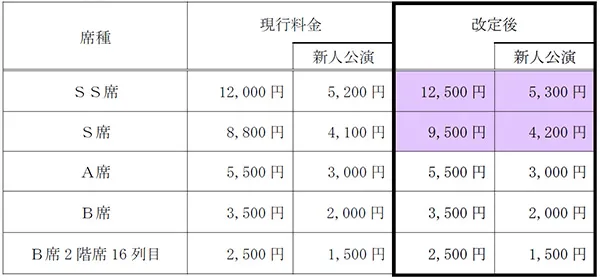 宝塚大劇場公演および東京宝塚劇場公演のSS席・S席の料金を改定します。