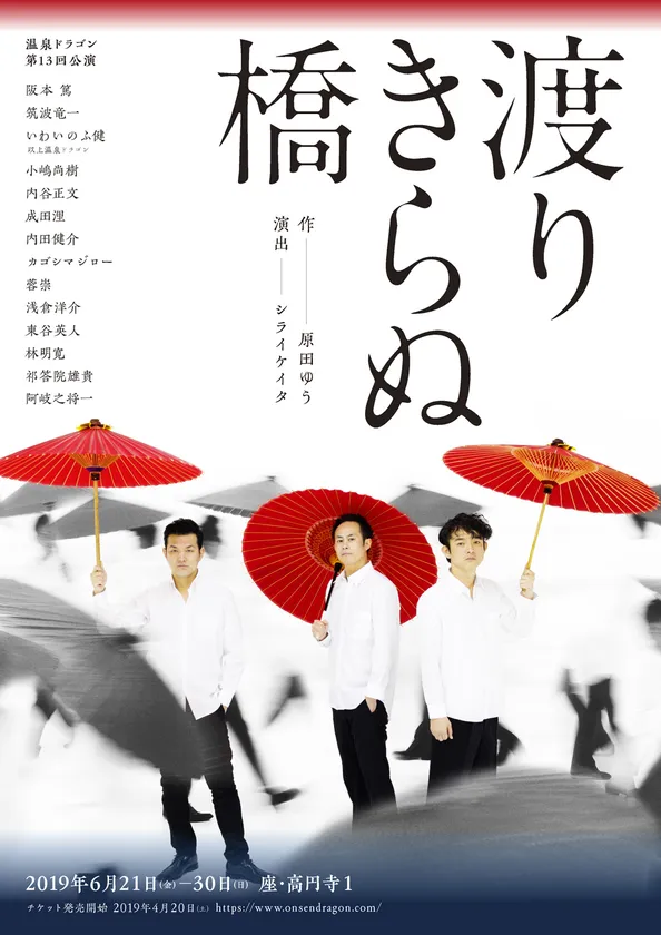 劇団「温泉ドラゴン」は、劇団に2人の劇作家を擁し、オリジナル作品を定期的に上演しています。今回の『渡りきらぬ橋』で演出を務めるシライケイタは、大胆さと繊細さを兼ねた演出が持ち味で「若手演出家コンクール2013」で優秀賞と観客賞をダブル受賞し、第25回読売演劇大賞(2018年)では杉村春子賞を受賞いたしました。また、今回の劇作を担当する原田ゆうは2012年の劇作家協会新人戯曲賞大賞、2014年の「日本の劇」戯曲賞最優秀賞を受賞しています。