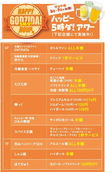 平日午後5時~7時を「ハッピー5時ダ!アワー」と題して、各店でお得なドリンク割引を実施します。