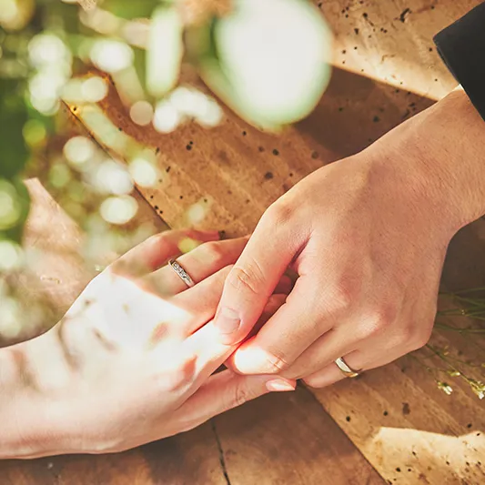 素材・リング幅・メレダイヤモンドを64通りからお選びいただき、熟練のクラフトマンがおふたりのためだけにお仕立てします。