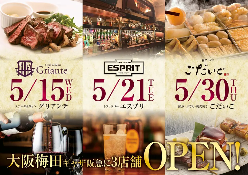 【令和幕開けと共に!】大阪・梅田に大人のダイニング3店舗を開店 5月15日(水)『ステーキ&ワイン グリアンテ』、 5月21日(火)『トラッドバー エスプリ』、 5月30日(木)『鮮魚×おでん×炭火焼き ごだいご』と 多種多様のオケージョンに スタイリッシュな3店連続オープン