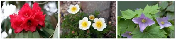 (左から)ロードデンドロン・アルボレウム、チングルマ、シラネアオイ