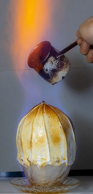 メレンゲに包まれたかき氷を、火がついたラム酒で炙ることで、焼きマシュマロのような甘さと、ほんのり香るラム酒の風味で、大人の味わいに仕上がります。