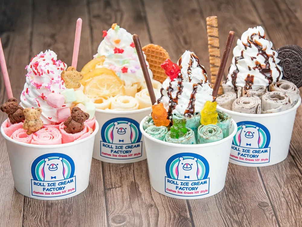 鉄板上で、薄く延ばしたアイスクリームを熟練の技でロールします。