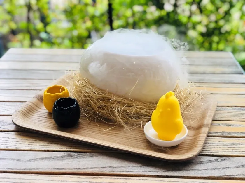 たまごの形をした器の中からぴょっこり。顔を出したひよこは、かき氷でした。