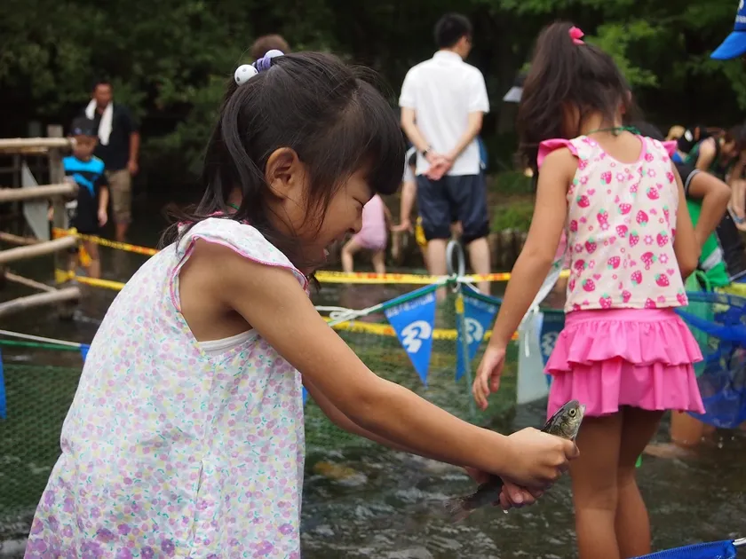 じゃぶじゃぶの河原全域を使ったつかみ取り大会が開催されます。ゴールデンウィーク中に開催されるので、ぜひ家族でご参加ください。
