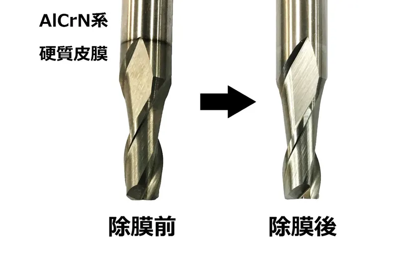 クロム系硬質皮膜は、耐摩耗性や耐酸化性の向上に効果的であることから切削工具・金型などに幅広く採用されています。使用過程で硬質皮膜が磨耗して寿命に達した劣化品をリユースするためには、薬液などを使用して元のコーティングを除膜する必要があります。しかし、従来市販品の除膜液は1マイクロメートル除膜するのに約1時間と長時間を費やすことや、除膜速度の促進には薬液の加温が必要な点が、作業効率低下の課題となっておりました。