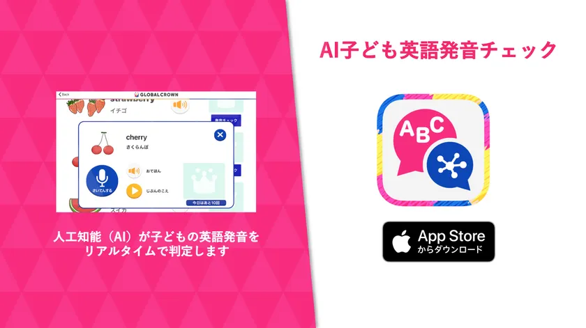 子ども向けオンライン英会話「GLOBAL CROWN(グローバルクラウン)」を運営する株式会社ハグカム(本社:東京都渋谷区、代表取締役:道村 弥生)は、子どもの英語発音チェックアプリ「AI子ども英語発音チェック 英語試験対策」の提供を開始いたしました。
